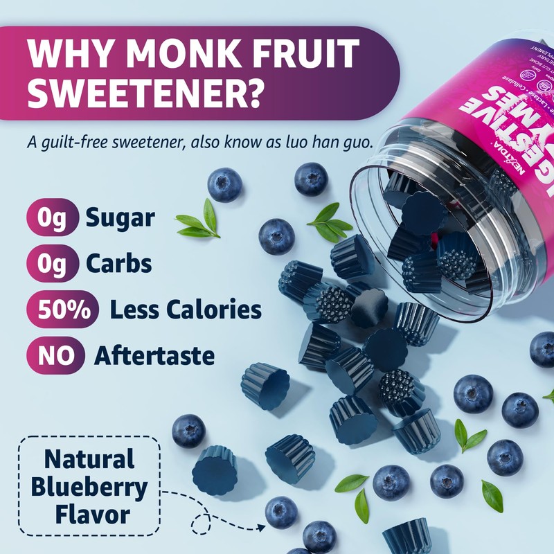 Sugar-Free, Monk Fruit Sweeteners: Our digestive enzyme gummies are sweetened with monk fruit, which is natural and has 50% fewer calories than regular sugar—a good option if you don’t tolerate sugar alcohols like erythritol or xylitol. Compared to other sweeteners, it has no aftertaste and is harmless to dogs. With natural blueberry flavors, every bite is a tasty and nutritious treat for your body and taste buds.