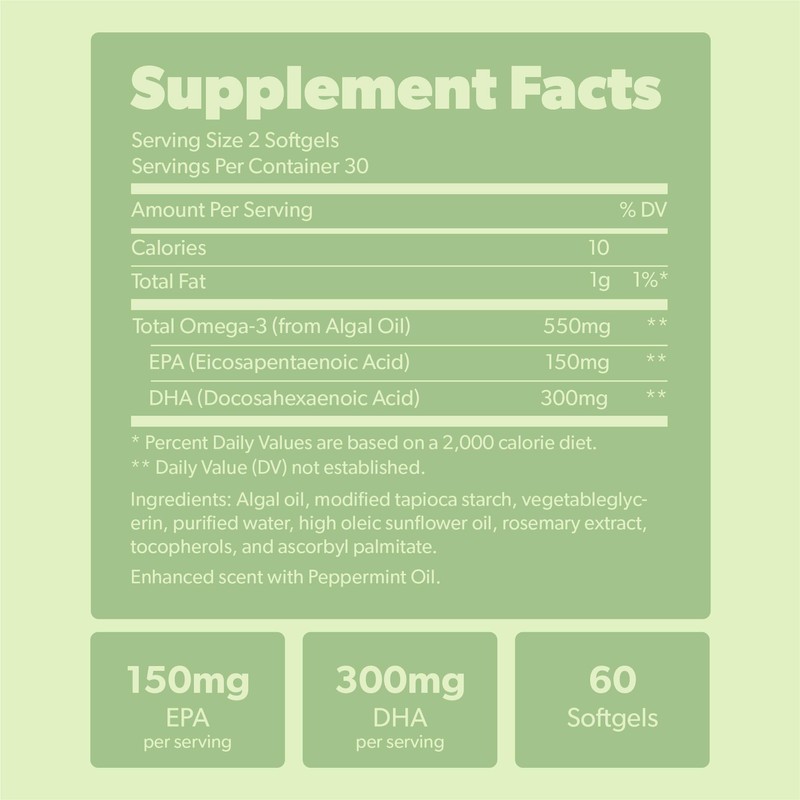 Vegan Omega 3 Supplement - Plant Based DHA & EPA Fatty Acids - Carrageenan Free, Alternative to Fish Oil, Supports Heart, Brain, Joint Health - Sustainably Sourced Algae - 60 Softgels