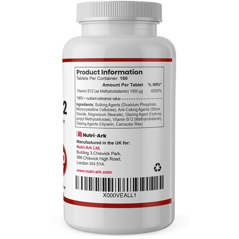 Vegan Vitamin B12 Methylcobalamin 1000mcg 180 Tablets (6 Months Supply) Made in The UK by Nutri-Ark