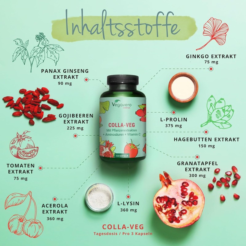 • For skin and bones: our collagen complex provides everything for the body's own collagen synthesis. The two amino acids L-lysine and L-proline are the basic building blocks. * Natural Acerola Vitamin C contributes to collagen formation for normal functioning of bones, skin and cartilage. A superfood mix of Panax ginseng, pomegranate extract, rosehip, goji extract, ginkgo biloba and tomatoes provide valuable lycopene, flavonoids, polysaccharides and ellagic acid.