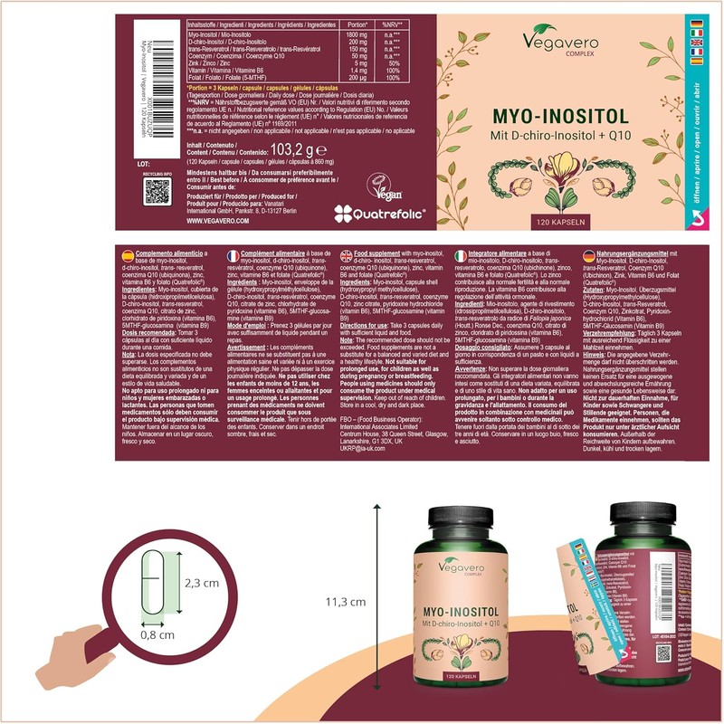 Vegavero® Inositol Complex – Myo-Inositol & D-Chiro-Inositol with Folic Acid (Quatrefolic®), Resveratrol, CoQ10 & Zinc – Vegan, No Additives, 120 Capsules – Supports Hormone Balance & PCOS*