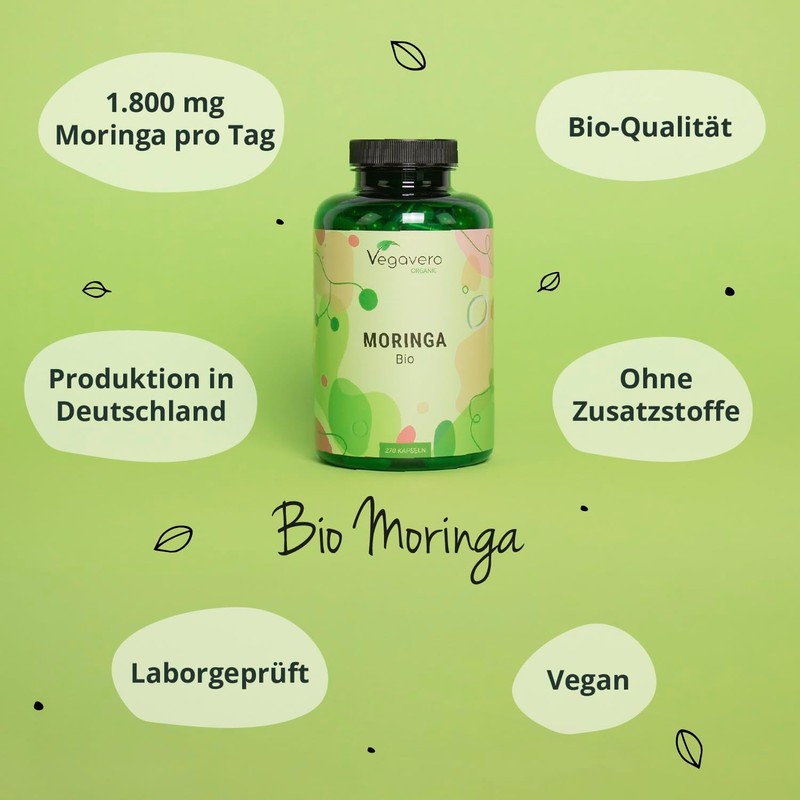 Vegavero® Organic Moringa 1800 mg – 270 Capsules, Vegan, Laboratory Tested, No Additives, German Made