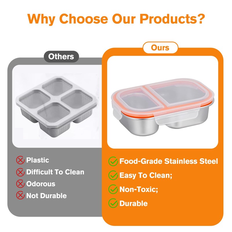 3.Our stainless steel snack boxes are designed to last. Use them instead of disposable boxes to reduce waste and save money.