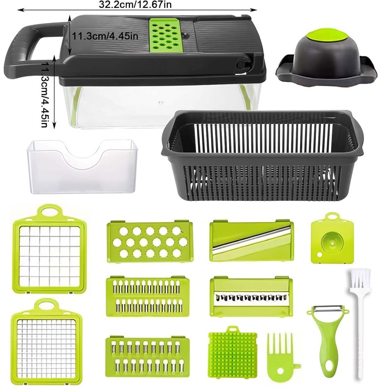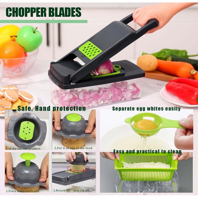 - 🥕【17-in-1 Multifunction】-Vegetable Chopper Slicer contains 8 different sizes of fruit chopper blades interchangeable blades ,1 hand guard, 1 draining basket, 1 water reservoir, 1 food container, 1 chopping board, 1 egg separator, 1 peeler, 1 toothed spatula for,1 small brush thick/thin slicing, dicing or chunking, shredding/shredding, thick or thin, grinding and chopping. Onion Chopper rust-resistant heavy- 420 stainless steel maintains sharp edges for crisp, smooth cuts and grating.