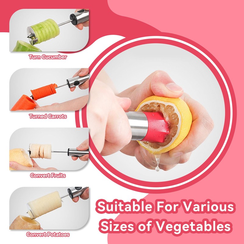 - Vegetable drill for hollowing: the vegetable spiralizer creates an even cavity, whether with fruit, vegetables, meat, etc. With veggie drill you can create your own shish kebab (fruit, vegetables, etc.) of any kind.