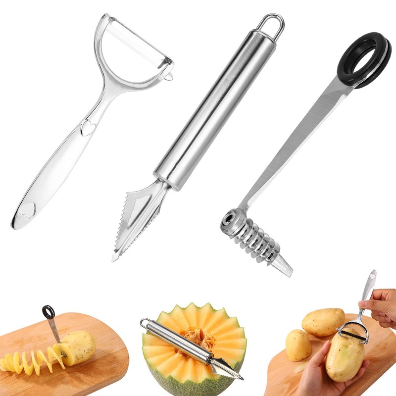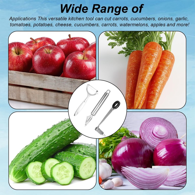 - Wide Application: The three sorts of cooking tools may be used in limitless ways to create culinary art. You may use the spiral knife to cut carrots or cucumbers into uniformly smooth spirals. You can make lovely watermelon baskets with the V-shaped carving tool. Additionally, you may use the kitchen peeler to peel apples, potatoes, and other fruits and vegetables.