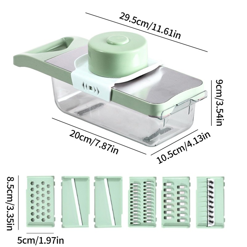 - Multifunctional in one: 7-in-1 multifunctional vegetable cutter, vegetable cutter with drip basket and 6 blades. It can be used as a sharp vegetable grater to grate carrots and potatoes for delicate side dishes, or as a professional vegetable slicer to cut cucumber and zucchini slices evenly.