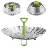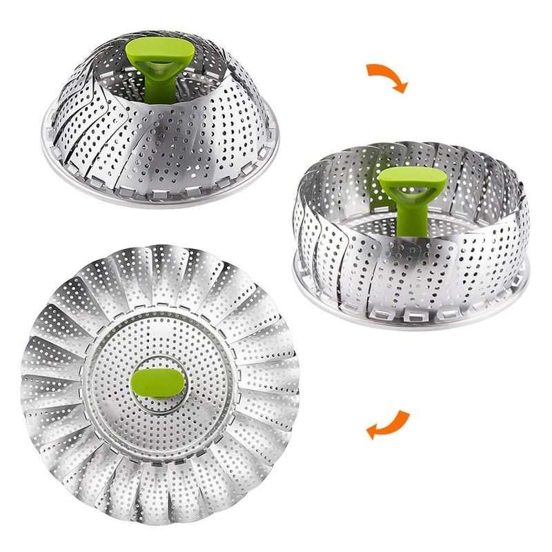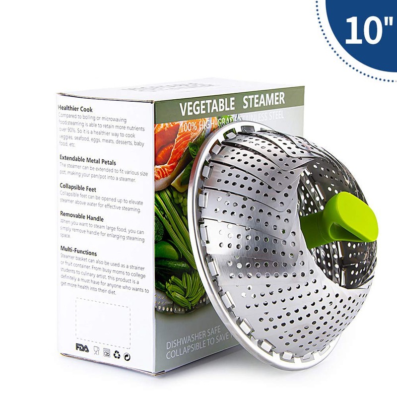 - EXPANDABLE & COLLAPSIBLE --You can easily open and close the steamer. Vegetable steamer basket collapsed diameter is 6.4 inches. It expands to 10 inches once petals are stretched out. The metal steamer basket blades can be folded compactly so you can save storage space than large mesh steamer basket.