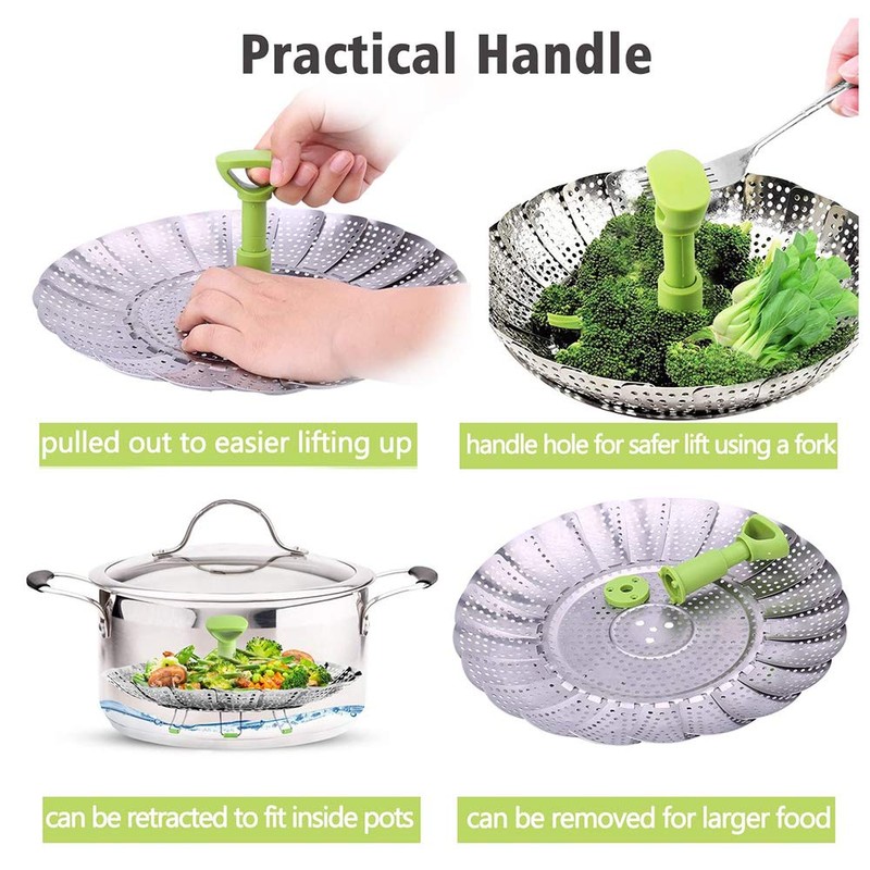 - UPGRADE DESIGN & QUALITY -- The steamer basket with premium food grade stainless steel petals design, food grade plastic handle and silicone feet will guarantee your health. Steaming is a healthy cooking choice because it helps retain more than 90% of the nutrients lost when either boiling or microwaving food. The foldable steamer basket can be used to steam veggies, seafood, eggs, meats, desserts, baby food and much more.