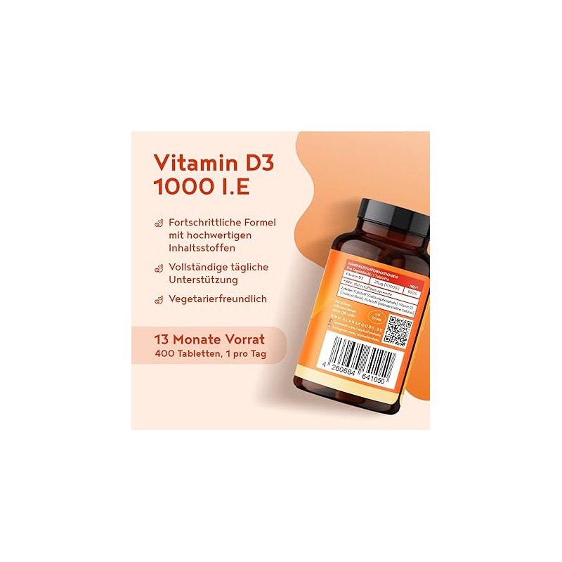 Vegetarian Vitamin D3 Tablets - with 25 μg (1000 IU) and Bioavailability - Sun Vitamin for Bones, Muscles and Immune System. 400 Tablets Alpha Foods