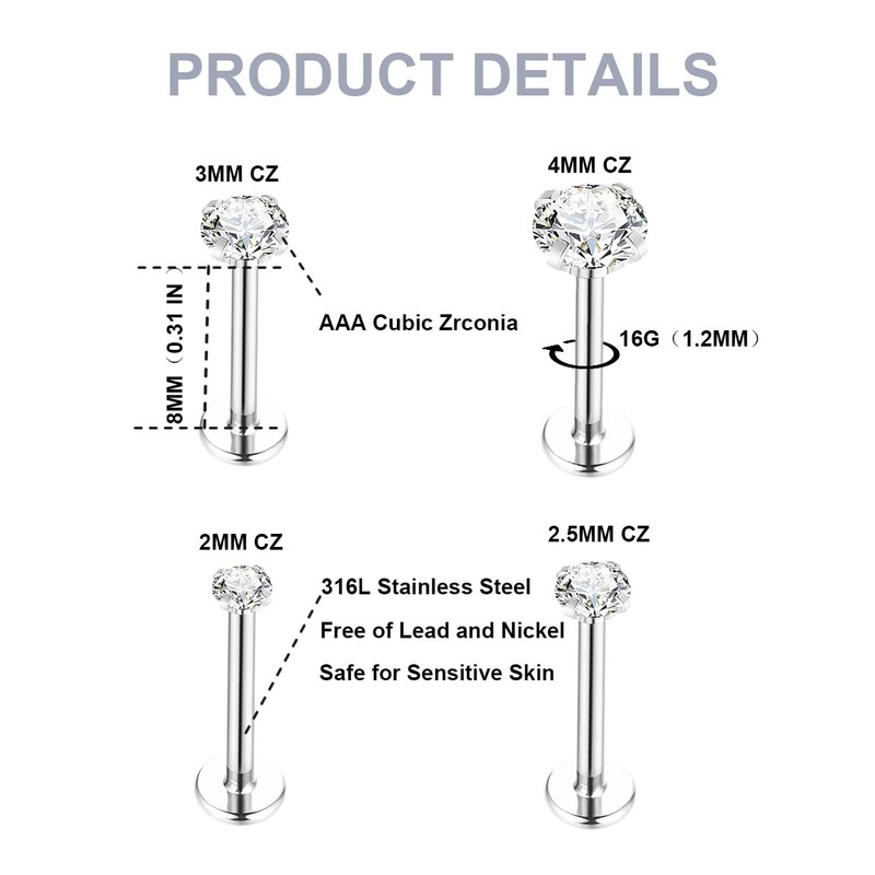 - PRODUCT SPECIFICATION: This Lip Ring Comes in a Wide Range Of Sizes. 16G/18G/20G Each Have a Bar Length of 6/7/8/10/12MM. The Cubic Zirconia Size is 2/2.5/3/4MM. You Can Choose The Appropriate Body Parts to Wear According to Different Sizes. Please Refer to The Dimension Diagram for Specific Dimensions