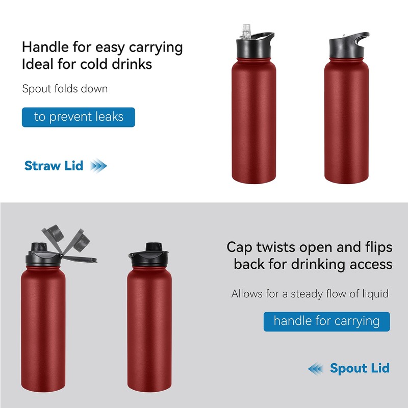 - 2 LEAK PROOF LIDS: Each insulated water bottle equipped with 2 leak proof wide mouth lids: 1 flip up straw lid and 1 easy twist spout lid to meet your needs for different occasions. Leak proof and have handle for easy carrying