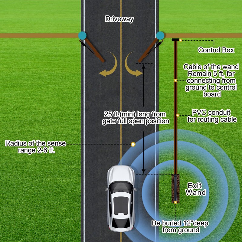 【Note 】: Firstly please ensure the distance from the wand to the gate full open position ismore than 25 ft.Secondly please be noted that the radius of the sense range of the wand is 2-6 ft, so please install the wand near the driveway as much as possible to ensure the wand can sense the vehicle past.Thirdly please be noted that you should remain 5 feet long cable for connecting from ground to control board, that means the distance from the wand to the control box should not exceed 45 feet.