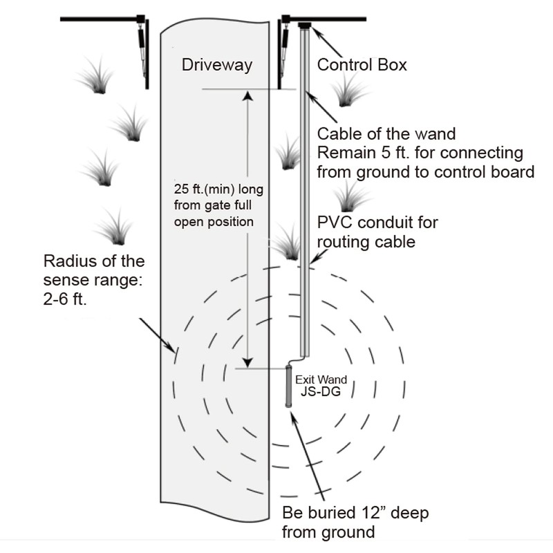 - Installation method: Vehicle Exit Sensor dig a hole approximately 2 inches deep and 24 inches long within 2 feet and parallel to the edge of the driveway. Next, dig a trench from this hole to a spot under the gate opener control box to run the cable from the WAND to the control box. Size of the trench is related to the size of the PVC conduit. Keep the WAND and the cable uncovered before the function has been tested 0K. Wiring the WAND to gate openers. wiring the WAND to GIANT swing gate opener.