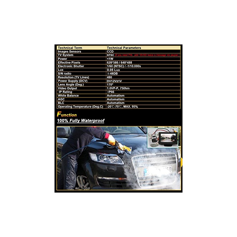 - IP67 waterproof, shockproof and night vision. It also can get clear, low-noise and high-quality image even in rainy weather, high-pressure car wash and in dark environments.