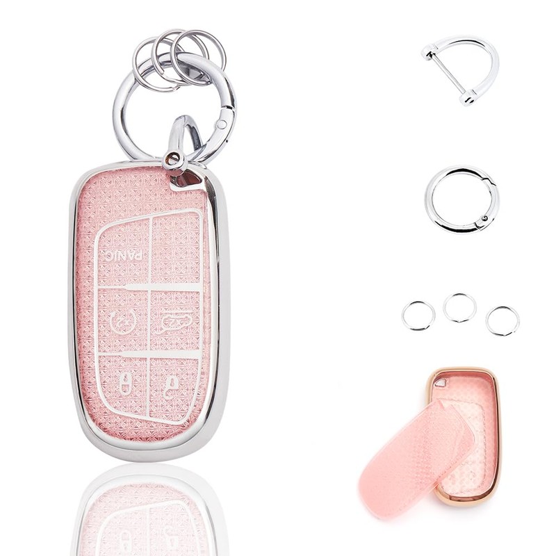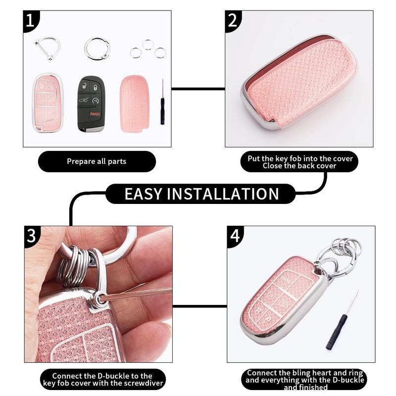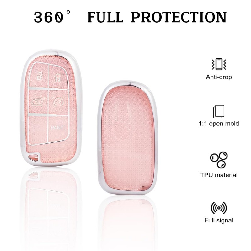 - The pink & silver car key fob case for Jeep Dodge Chrysler has the new crystal texture inside the front and back, made with premium TPU, thin, soft, cute, trending looking and pretty durable, make your key fob look new and special.There were plenty of hoops and loops on the key chain that you could use to organize other keys as well.