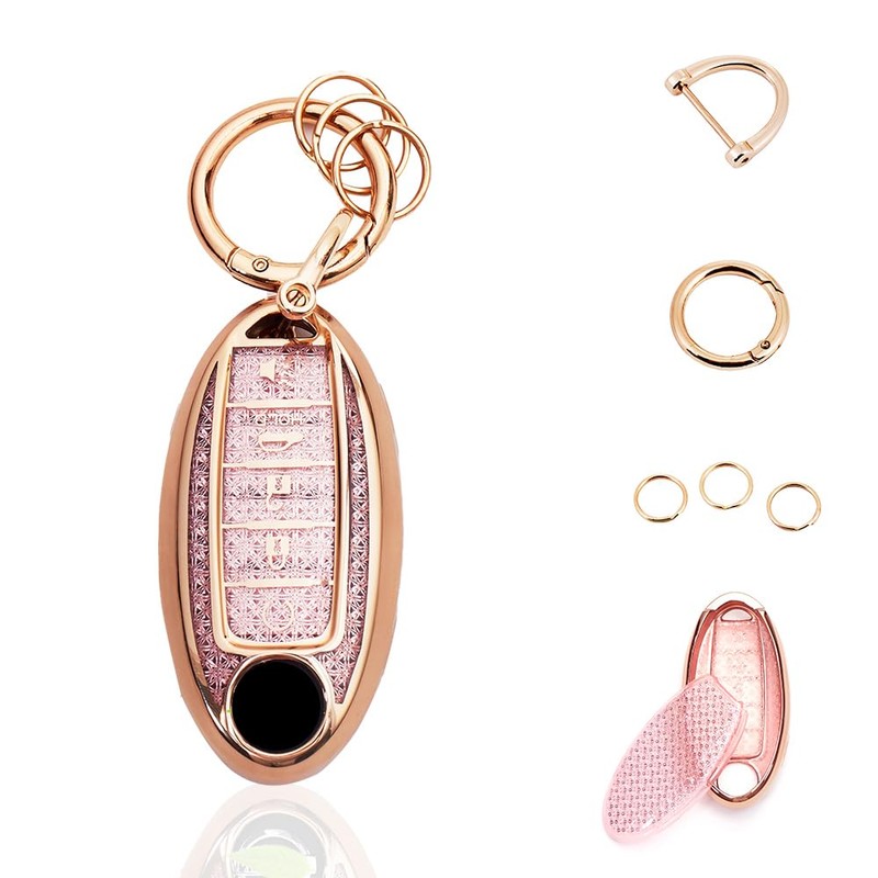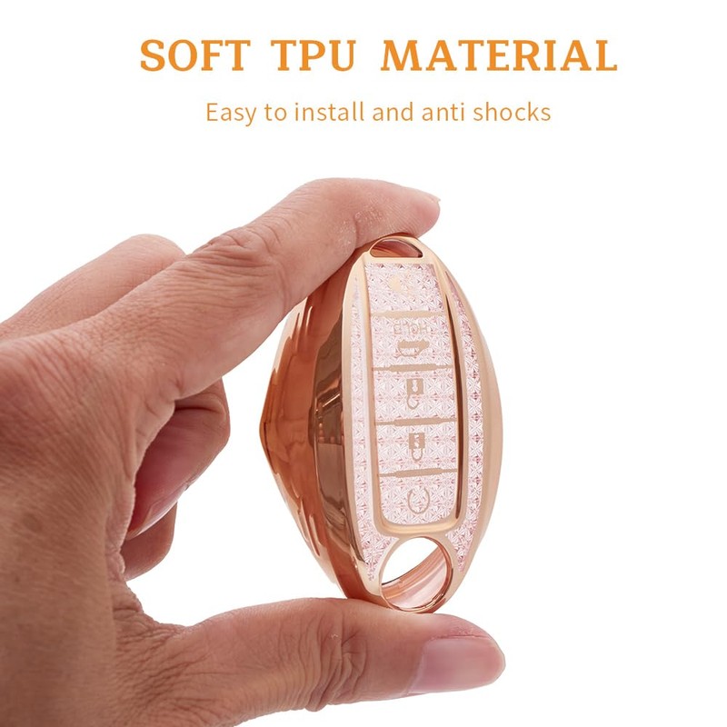 - The pink & gold car key fob case for Nissan Infiniti has the new crystal texture inside the front and back, made with premium TPU, thin, soft, cute, trending looking and pretty durable, make your key fob look new and special.There were plenty of hoops and loops on the key chain that you could use to organize other keys as well.