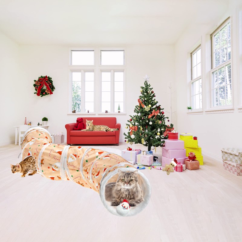 - 【Attentive Details】The cat christmas tubs are designed as a S shape, increases the fun of exploring. The peepholes on the sides of the cat tube allows your cat to enter and exit through different openings. The ball hanging on the front exit can arouse your pet to pounce it. On the end of the tube, there sewn 2 strings, which are used to tie up the tube when it is folded.