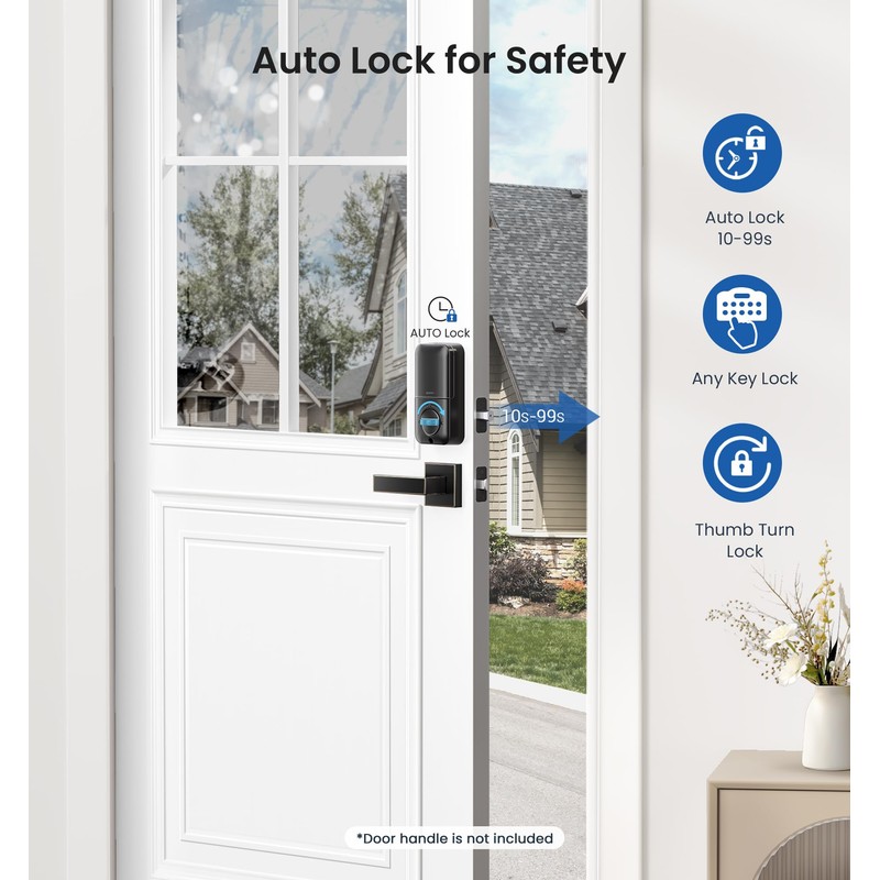 - Security Locking: "Smart door locking" - The door lock auto-locked in 10-99 seconds; Press and hold any key for 2 seconds to "One touch Lock"; Rotatable knob- lock/unlock in 1 second from inside.