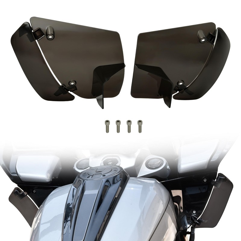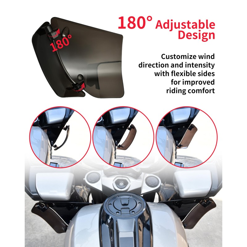 • Smoked adjustable side wings wind air deflector fairing fit for Harley Davidson 2023-later FLTRXSE, 2024-later FLTRX and FLTRXSTSE models. Please refer to the compatible list, and check the year and model of your motorcycle before purchasing it