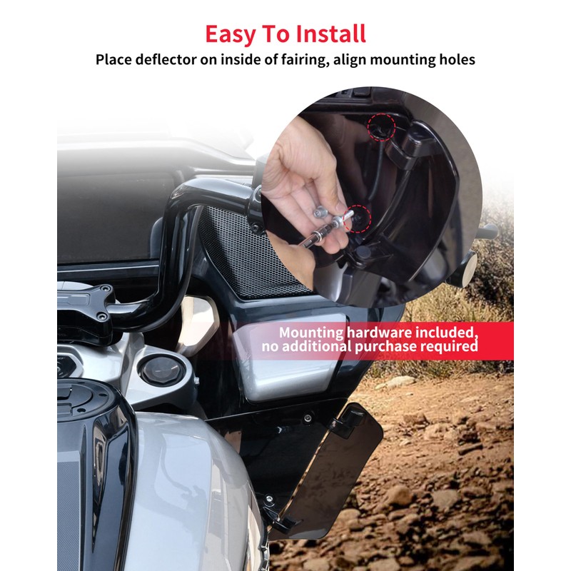 • Package Includes: 1 Pair adjustable side wings wind air deflector fairing and mounting hardware, 1 PCS installation instruction.