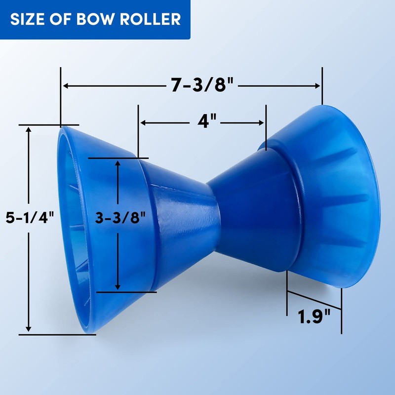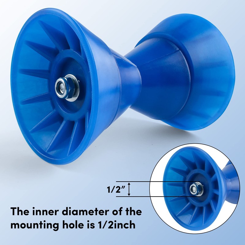 - 【Product Size&Assembly Includes】Inner roller is 4inch wide,Overall width is 7-3/8inch,The inner diameter of the mounting hole is 1/2inch.Fits 4 inch wide center roller bracket. This assembly includes the a 4 inch bow roller for boat trailer, the 2 bells, and bolt to mount.