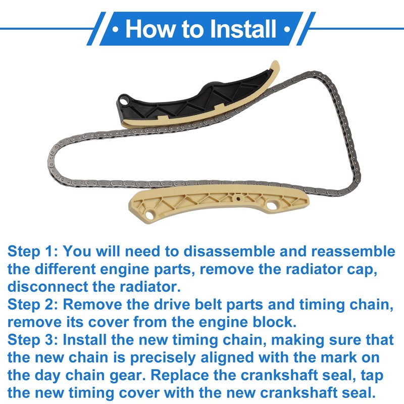 - How to use: Step 1: You will need to disassemble and reassemble the different engine parts, remove the radiator cap, disconnect the radiator. Step 2: Remove the drive belt parts and timing chain, remove its cover from the engine block. Step 3: Install the new timing chain, making sure that the new chain is precisely aligned with the mark on the day chain gear. Replace the crankshaft seal, tap the new timing cover with the new crankshaft seal.