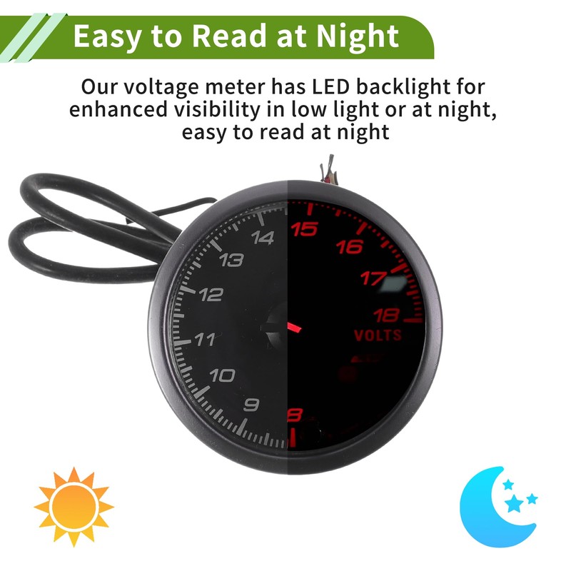 - Easy to Read at Night - Our electromechanical gauge with clear numbers and Analog can easily read the volt, has LED backlight for enhanced visibility in low light or at night, easy to view from all angles in any lighting conditions, practical and safe when driving at night