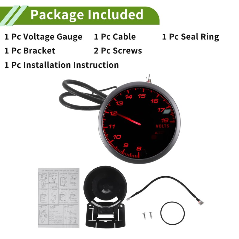Professional installation is recommended, the volt gauge comes in a standard 2.5" 60mm housing that fits in a variety of instrument pods, providing flexible mounting options. The universal car voltage meter 1 Pc Installation Instruction,1 Pc Bracket,1 Pc Seal Ring,2 Pcs Screws,1 Pc Cable can be installed well.