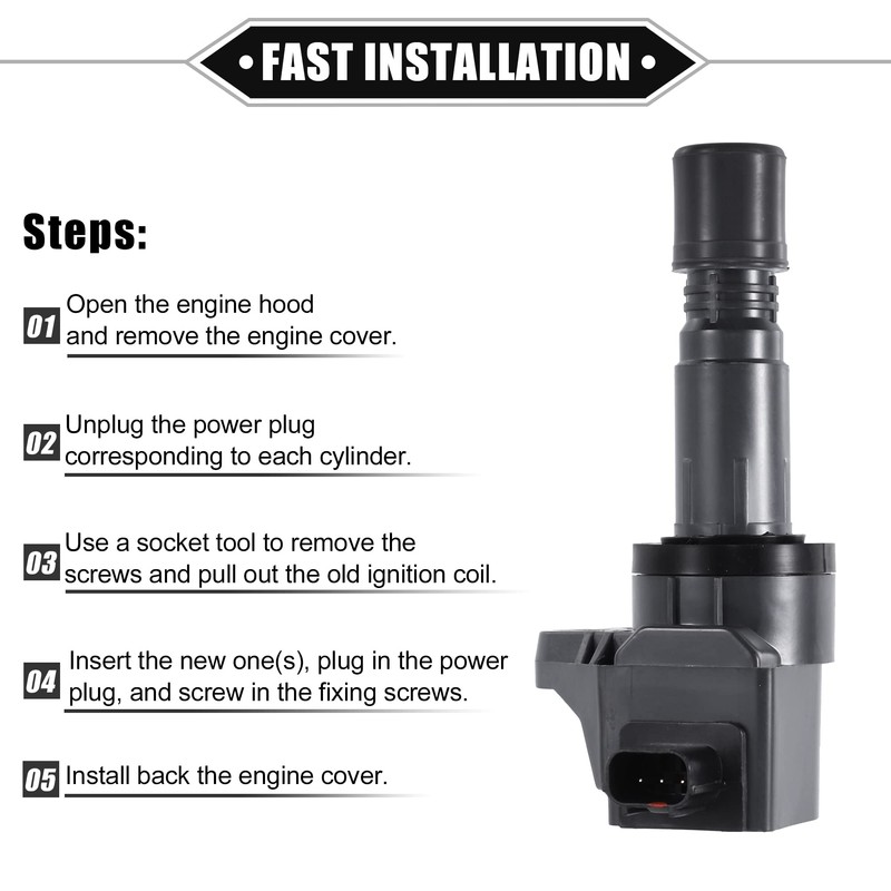 - EASY INSTALLATION - It can be installed quickly and easily by yourself. 1. Open the engine hood and remove the engine cover. 2. Unplug the plug corresponding to each cylinder. 3. Use a socket tool to remove the screws and pull out the old ignition coil. 4. Insert the new one(s), plug in, and screw in the fixing screws. 5. Install back the engine cover.