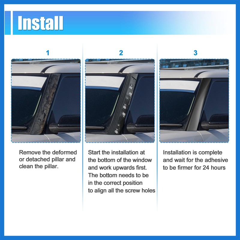 - Design: EASY INSTALLATION: First, remove the deformed or detached pillar and clean the pillar. Then start the installation at the bottom of the window and work upwards first. The bottom needs to be in the correct position to align all the screw holes. At last, when installation is complete please wait for the adhesive to be firmer for 24 hours