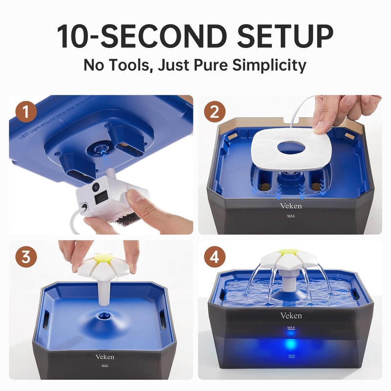 - Three Water Flow Modes to Stimulate Drinking Interest. 1)Hexagonal Flower Outflow: Silent operation, ideal for timid young pets. 2)Square Fountain Spray: No running water noise, mimicking a natural drinking experience. 3)Simulated Natural Water Sound: Gentle flow sounds to spark curiosity and encourage hydration.