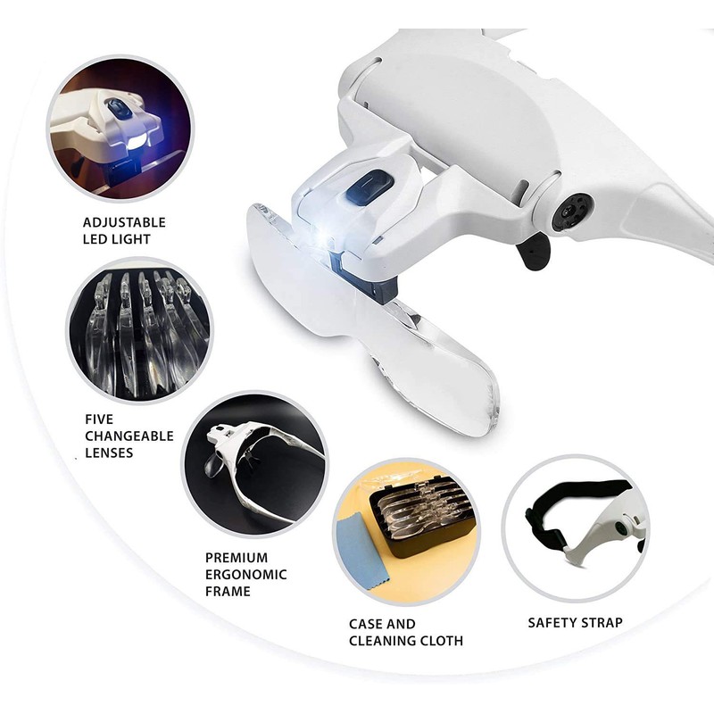 • 5 interchangeable lenses: 1.0x, 1.5x, 2.0x, 2.5x, 3.5x. The individual lenses can be replaced and easily removed. The lenses can help you get a larger and wider image. They can be used with your normal glasses when wearing glasses.