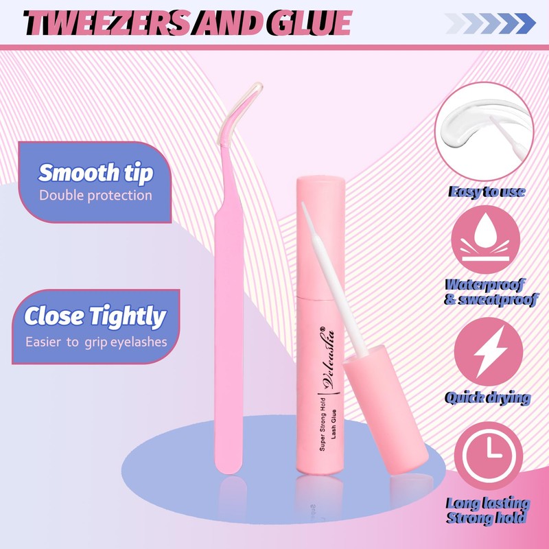- Strong Adhesive Eyelash Glue & Tweezer: The glue is made of high quality materials, strong adhesive, waterproof and sweatproof. Tweezer: They are specially designed for eyelash extensions with a tight head closure, and and lightweight, allowing you to easily remove eyelashes and make your wearing process easier and faster.