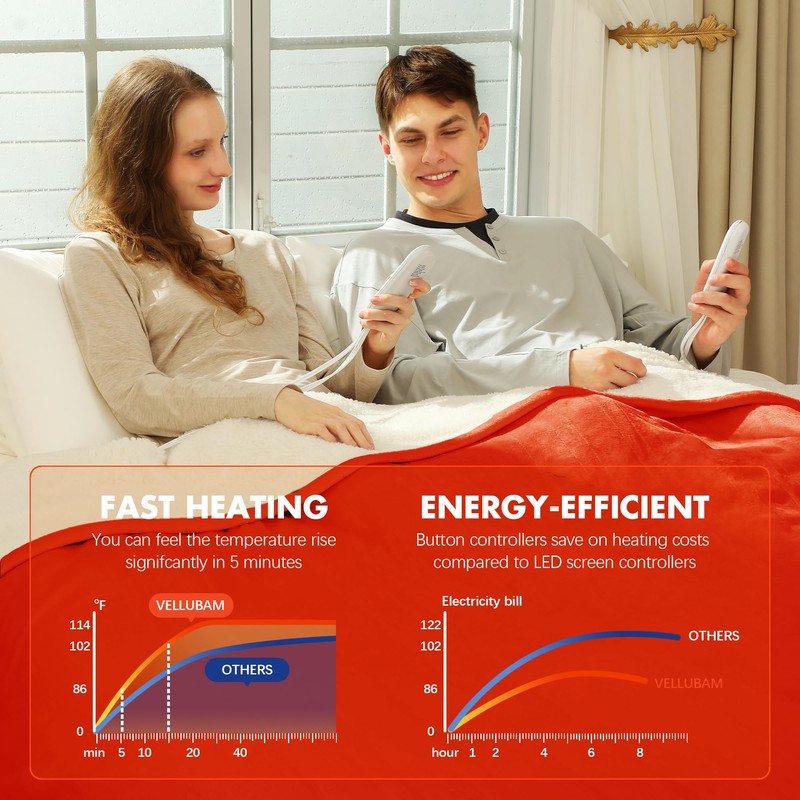 - ETL Certified - The VELLUBAM electric blanket is rigorously tested and certified by ETL, ensuring enhanced safety and minimal electromagnetic radiation during use. Featuring advanced overheat protection, the heating blanket automatically stops heating or cuts power if temperatures rise too high, eliminating potential hazards