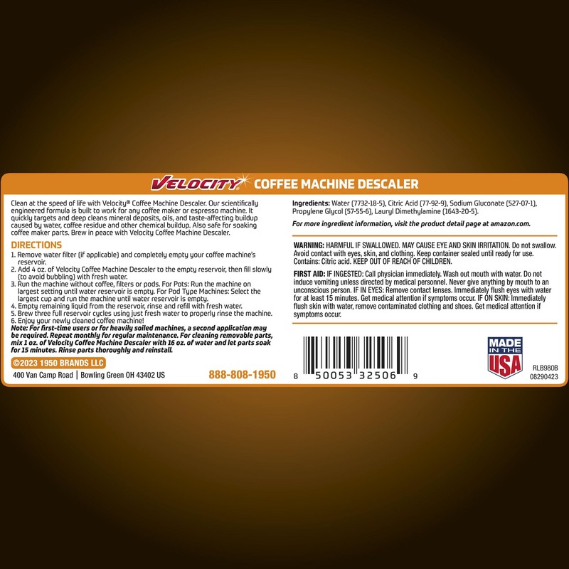 Velocity Coffee Machine Cleaner and Descaler – 4 Uses Per Bottle. Deep Cleans Coffee Makers & Espresso Machines, Coffee Maker Cleaner compatible with Keurig, Breville, Nespresso, Mr. Coffee & More.