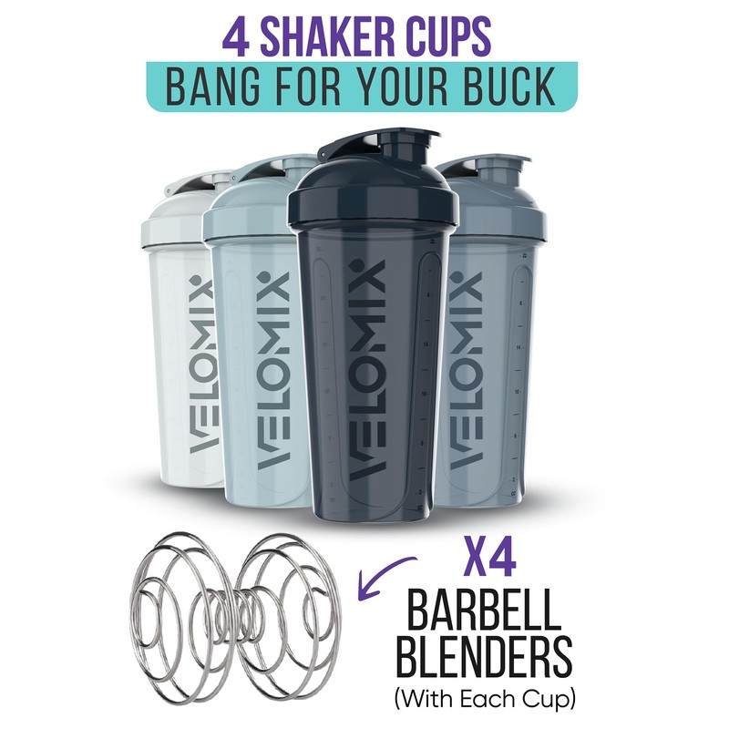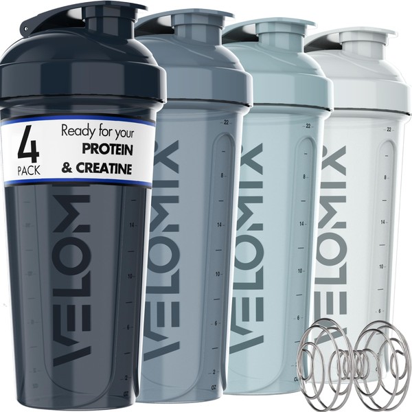 VELOMIX -4 PACK- 28 oz Shaker Cups for Protein Shakes - 4x Wire Whisk | Leak Proof Protein Shaker Bottles for Protein Mixes | Protein Shaker Bottle Pack | Mixer for Protein Shakes