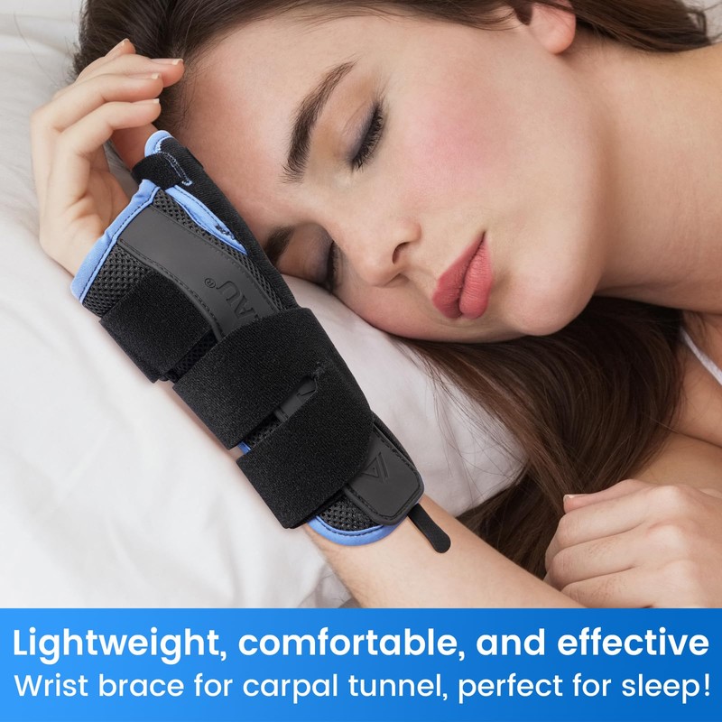 - 【BREATHABLE AND LIGHTWEIGHT】This Thumb Wrist Splint is composed of sandwich mesh and pure cotton, the entire product weighs just 0.18 pounds (80 grams), less than two eggs. It doesn't contain latex material, it's light and breathable, soft and skin-friendly, and absorbs sweat quickly. It keeps your wrist dry and odorless, keeps you comfortable in constant use, and reduces wrist pain without affecting your activities. This Carpal Tunnel Brace is especially suitable for sleeping and hot summer.