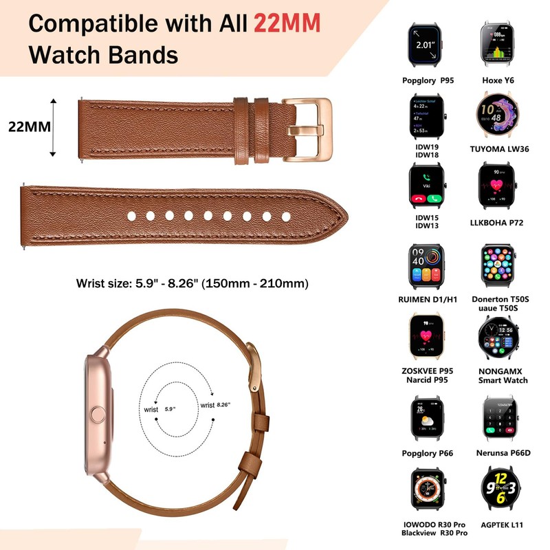 - Compatible models: this leather 22 mm Gloryfit strap for Veryfit IDW19 IDW18 IDW16 IDW13, Smart Watch TUYOM LW36, Ruime Smart Watch H1/D1, Smart Watch T50S, Smart Watch P66 P66D P72 P95, Nongam Smart Watch, Smart Watch Y6. KALINC Smart Watch, Smart Watch Smart Watch YB54, G39, AGPTE LW11 etc. (Please check the width of the original strap connection before purchase)