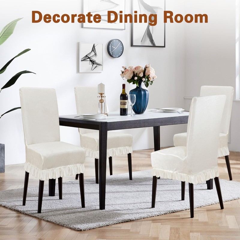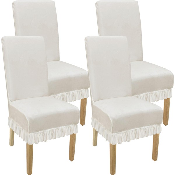Velvet Dining Room Chair Cover Stretch Thicker Dining Chair Covers Set of 4, Removable & Soft Velvet Kitchen Chairs Covers Washable Parsons Chairs Slipcover for Kitchen Room (Beige, with Skirt, 4PCS)