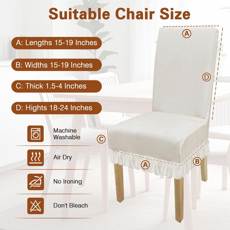 - Just-Right Fit: WUSOUPU velvet dining table chair covers is suitable for chairs with backrest height of 18-24 inches, backrest width of 15-19 inches; seat length of 15-19 inches, seat width of 15-19 inches and 1.5-17 inches thick. Please refer to the dimensions in the picture and measure your chair before purchase