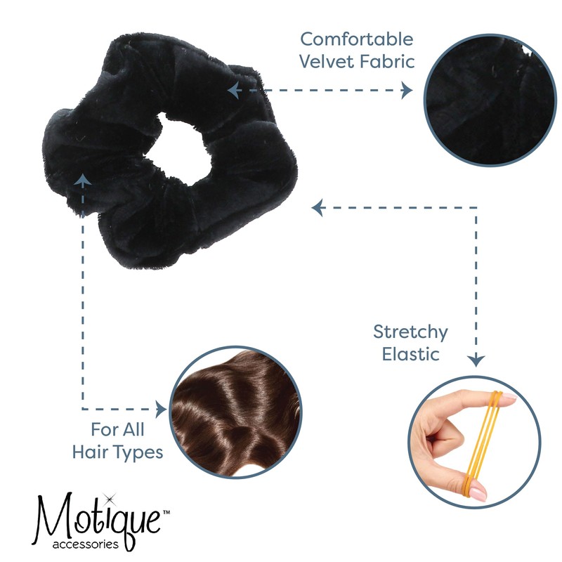 This is a set of adorable and stylish solid colored velvet scrunchies. They are made of a soft velour fabric. They come in thirteen different colors to match any outfit. Looks great in your hair and is a no-crease hair scrunchy for all day comfort. Measures approximately 5.5 inches in diameter when laid flat.