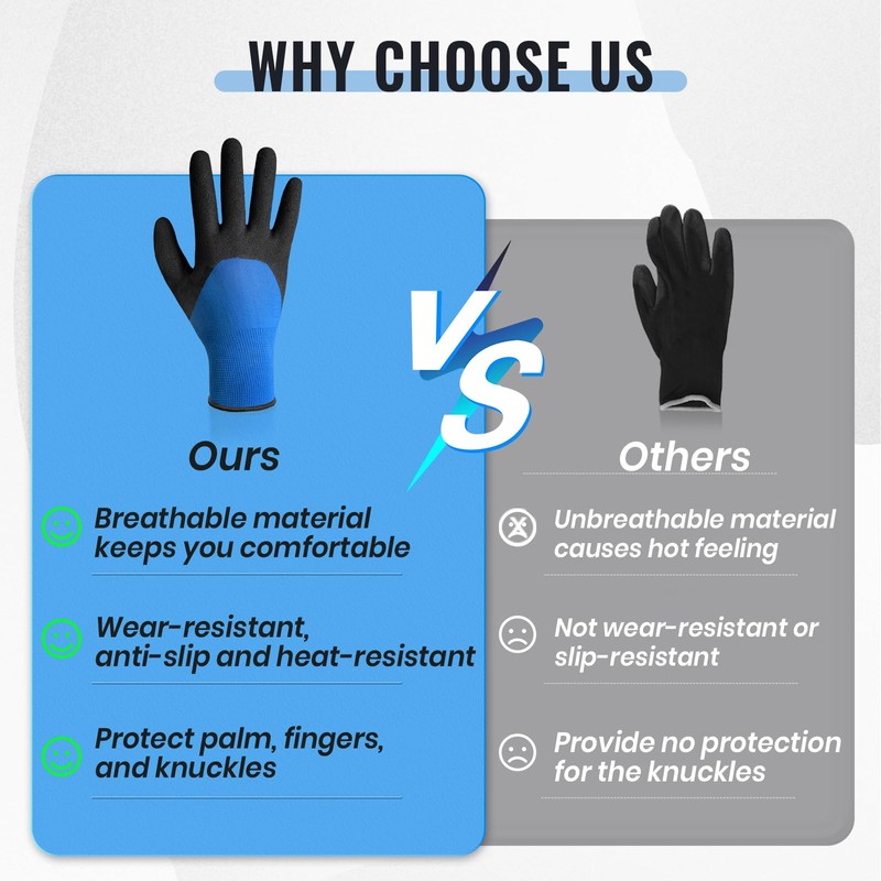 - NON-SLIP GRIP: Protective gloves feature a nitrile frosted coating on the palm, fingers and knuckles, which offers firm grip and durability. Whether you're working indoors or outdoors, these work gloves offer comfortable and reliable protection for your hands.