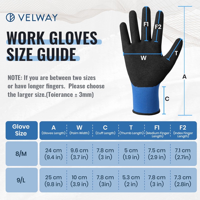 - MULTIPLE USES: VELWAY nitrile coated work gloves are ideal for general light to medium duty work, such as Assembly, Auto Repairing, Gardening, DIY, Driving, Warehouse, Cleaning, Construction, Handling, Logistic, Home improvement and so on.