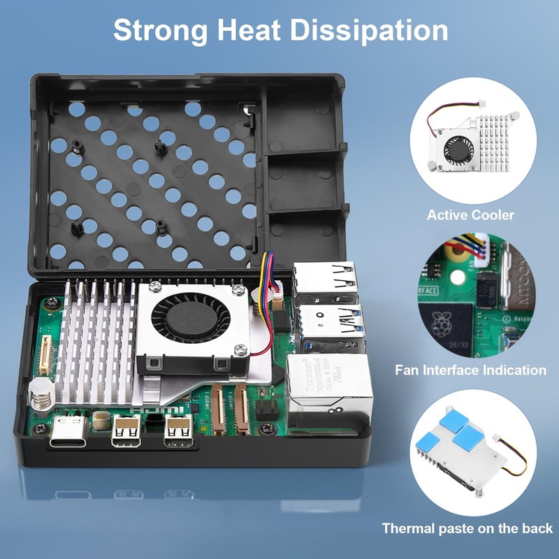 - Cooling Kit for Pi 5: Compete with active cooler for Pi 5, provide Ras Pi 5 board with better cooling effect in using. The Pi 5 Case can accurately access usb-c power jack,Micro HD Out ports, usb ports, Ethernet jack, card slot, power button, 4-lane MIPI DSI/CSI connectors and so on, and it also supports installation of cooling fan