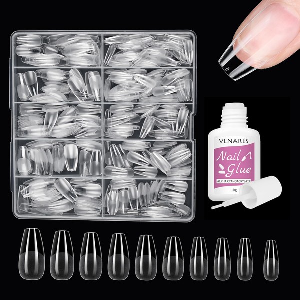 Venares False Nails Tips Set Short, 500 Pieces Medium Coffin Tips for Gel Nails Set 10 Sizes Nail Tips Set with Glue, Full Cover Nail Tips Pre-Buff, Pre-Polished Soft Gel Tips Nails