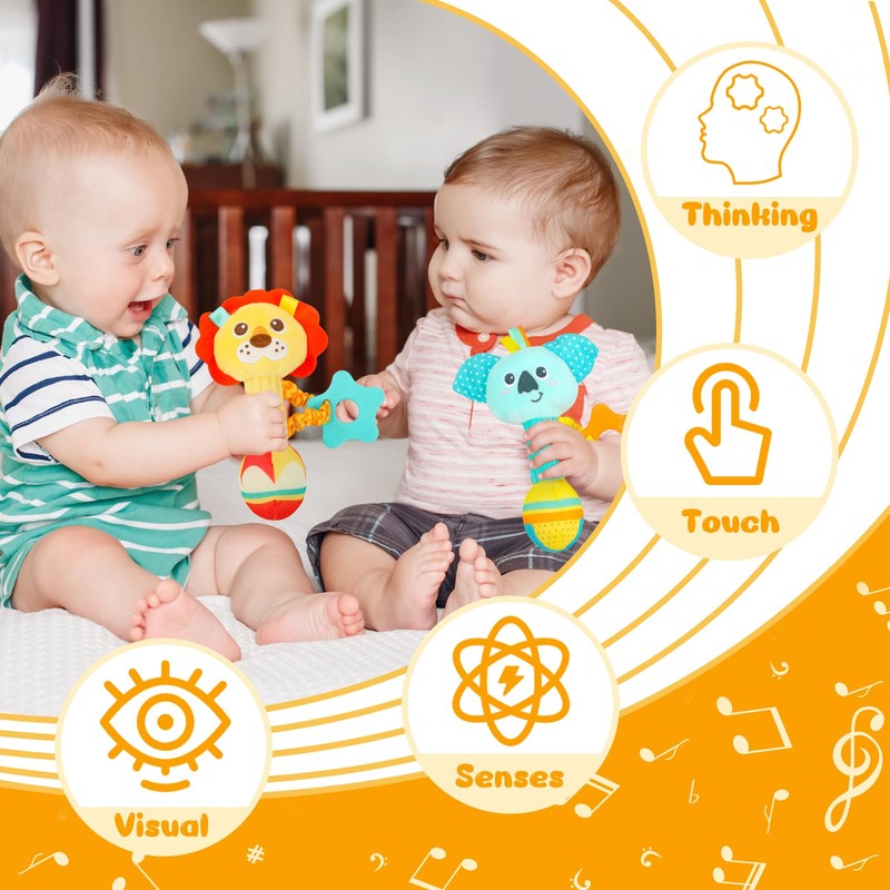 - Early Development Toys These soft rattle toys produce a gentle bell sound when shaking or squeezing. They attract baby's attention, improve sensory stimulation and hearing development, improve baby's intelligence and train baby's hand-eye coordination and concentration.