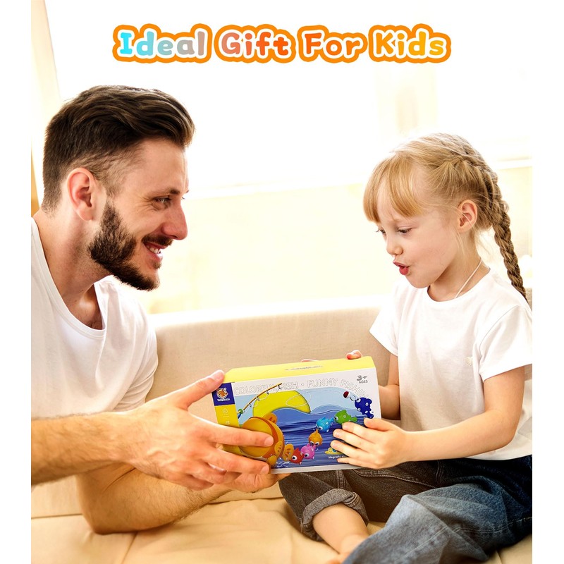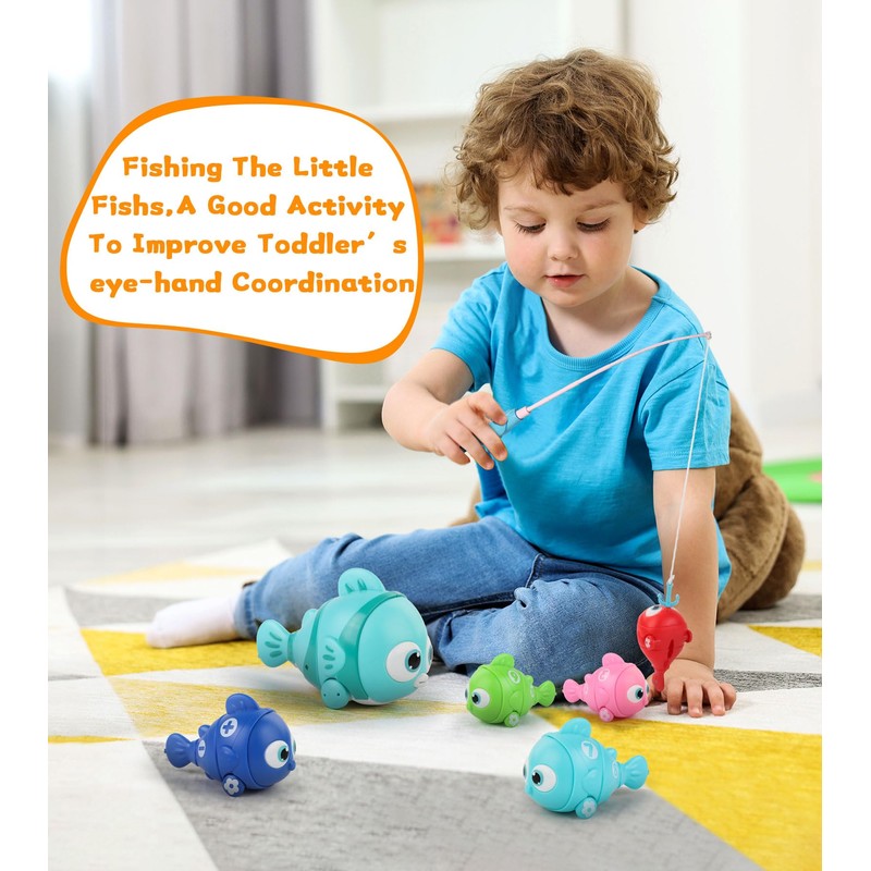 - FUN FISHING GAME : Included in the package is a fishing rod that magnetically lifts the little fish off the ground, and each fish has a magnet in its mouth to make it look like the fish are actually biting on the hook.