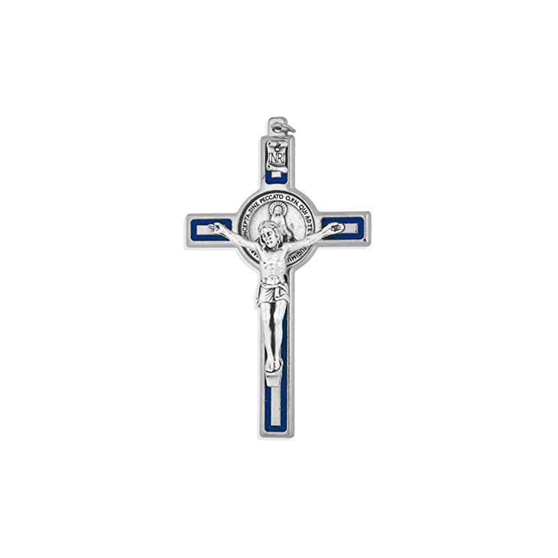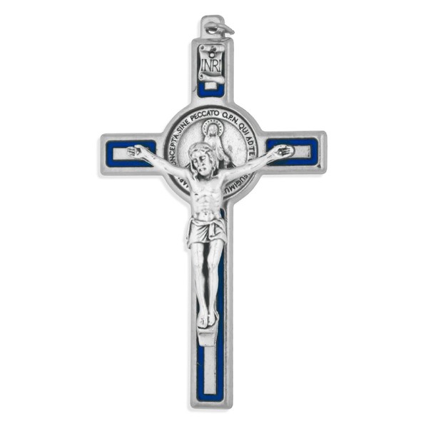 Venerare Marian Crucifix Pendant with Miraculous Medal and Blue Enamel (Silver)