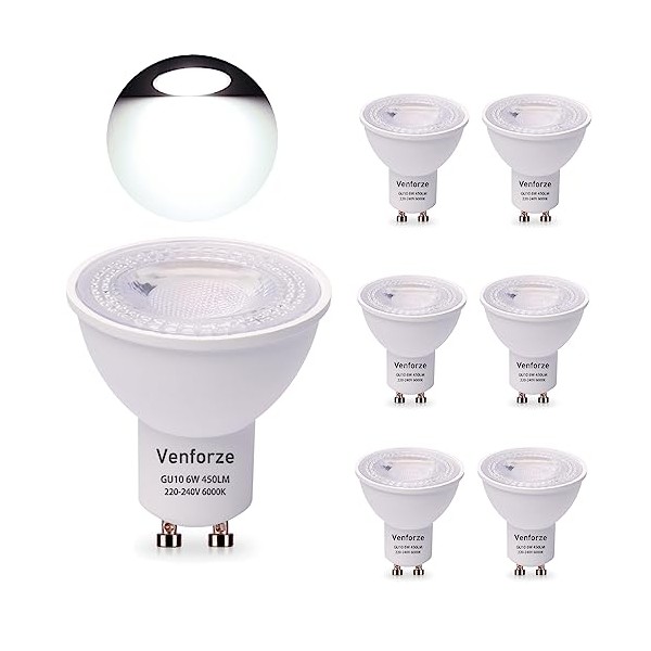 Venforze Venforze GU10 Led Bulbs Cool White, 6W 450LM 6000K Spotlight Bulbs, 38 Beam Angle Energy Saving Gu10 Bulbs, Track Led Spotlight Bulbs AC220-240V, 50W Halogen Equivalent, Non-dimmable, Pack of 6